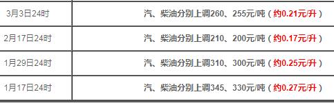 今年受国际油价持续上涨的原因,我国油价已经经历了四轮增长。从1月17日第一次调整,到3月3日第四次调整,国内汽、柴油价格每吨分别累计提高1125、1085元/吨。