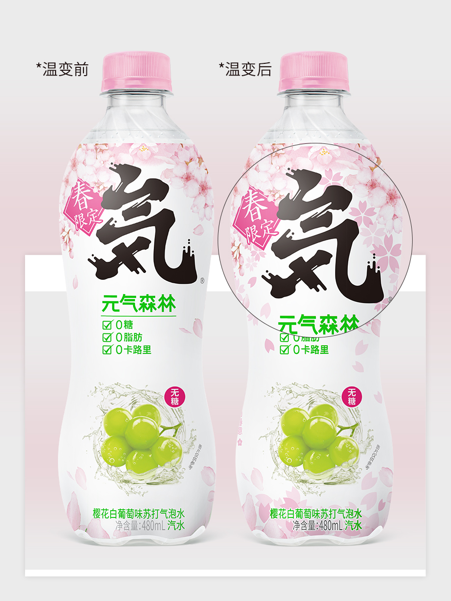 该款樱花白葡萄口味的春季限定气泡水瓶身包装存在温变效果,当周边气温降至 8℃以下时,瓶身会呈现朵朵樱花绽放的效果。这也是元气森林首次推出温变瓶相关创新产品。