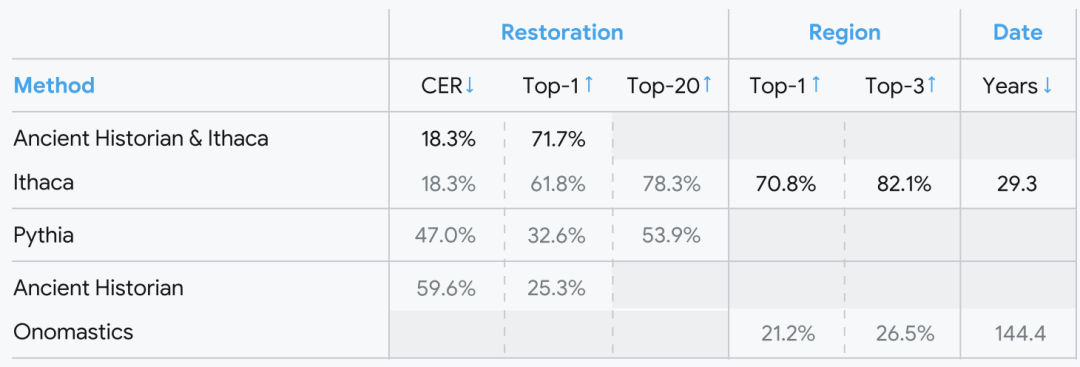 单独工作时,Ithaca在修复受损文字方面达到了62%的准确率;与DeepMind合作的历史学家在单独修复古代文献时,准确率为25%;而当历史学家与Ithaca合作时,修复受损文字的准确率提高至72%。