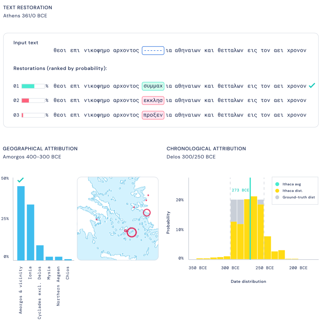 深度神经网络Ithaca即是他们的最新成果,它以荷马史诗《奥德赛》中的希腊岛屿命名,在DeepMind此前专注于文本修复的系统Pythia基础上扩展而成。