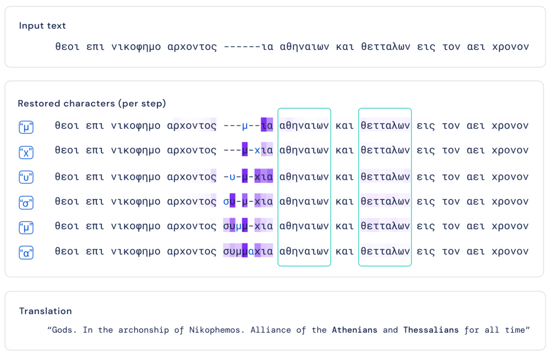 为了将Ithaca作为研究工具的价值最大化,研究团队还创造了一些可视化辅助工具,来确保历史学家能够轻松地解释Ithaca输出的结果。