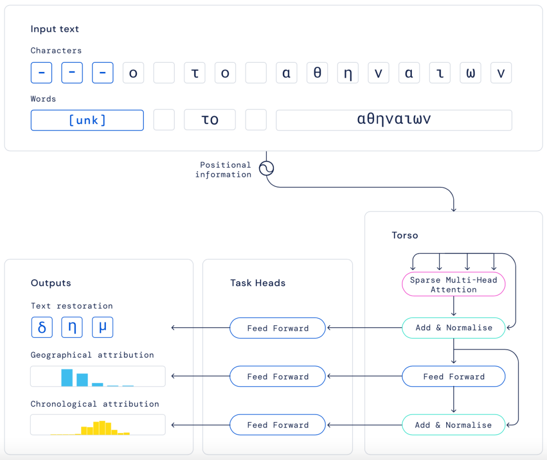 DeepMind使用单词和单个字符作为输入来训练模型,以确保Ithaca用这类文本时能正常工作。模型核心的稀疏自我注意机制并行地评估这两个输入,允许Ithaca根据需要评估铭文。