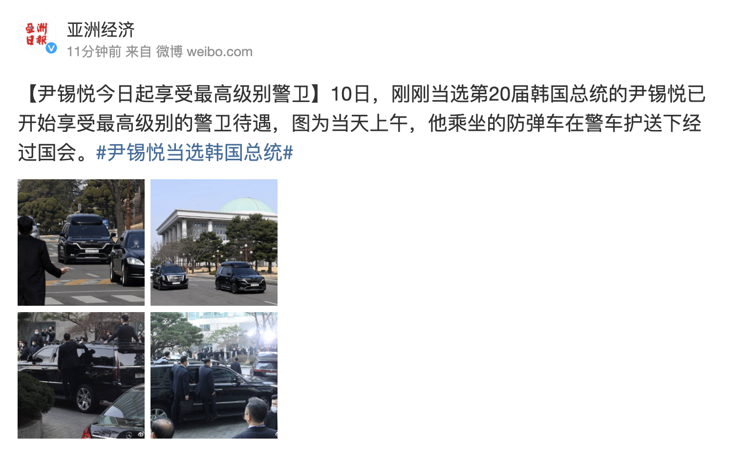 据韩国《亚洲日报》3月10日报道,刚刚当选第20届韩国总统的尹锡悦已开始享受最高级别的警卫待遇。