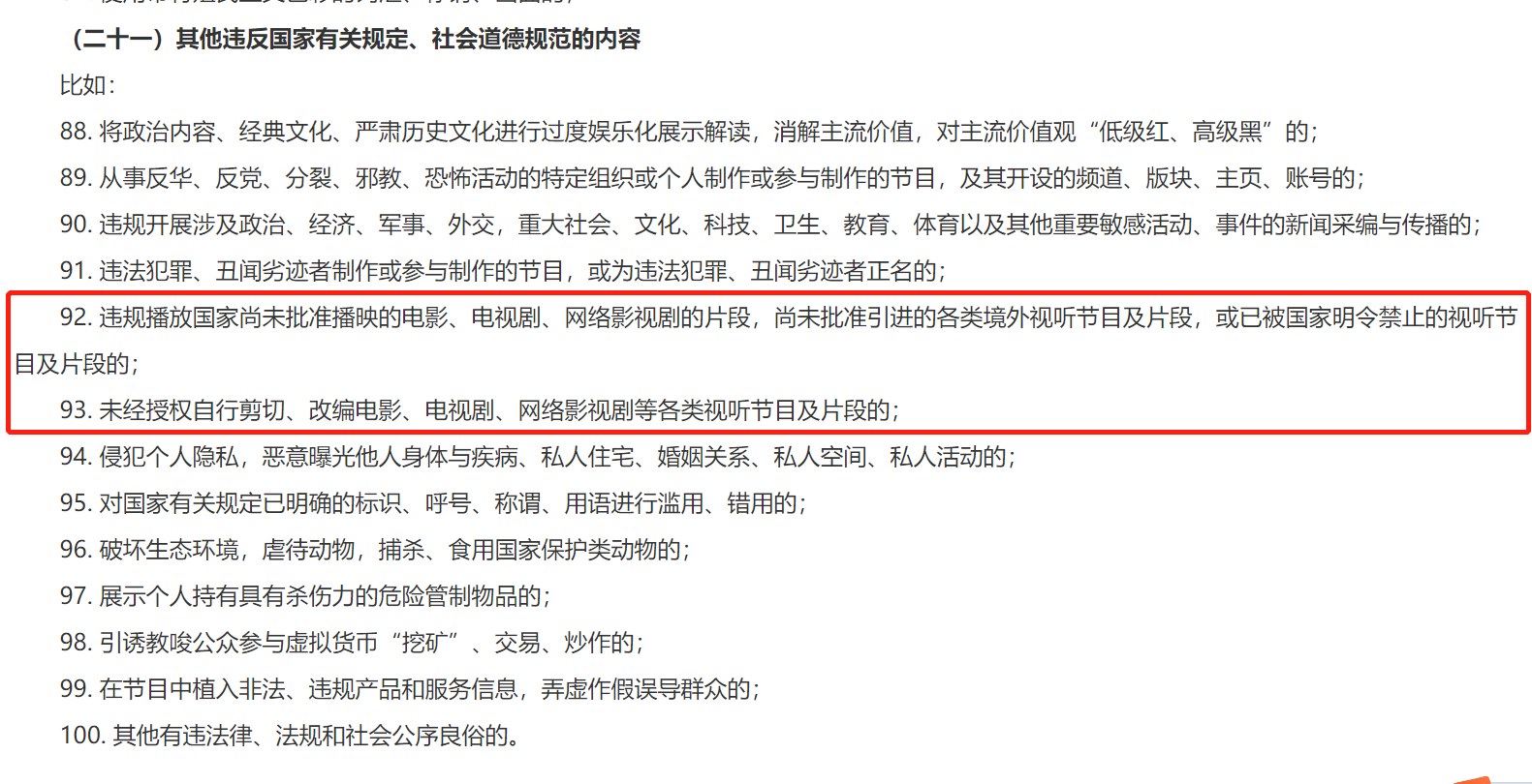 12月15日,中国网络视听节目服务协会发布《网络短视频内容审核标准细则(2021)》。相较2019年版本,本版细则的第93条进一步规范了版权要求:短视频节目中不得出现“未经授权自行剪切、改编电影、电视剧、网络影视剧等各类视听节目及片段的”具体内容。