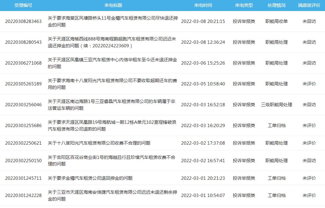 三亚12345政府服务热线3月8日投诉列表显示,一名消费者于今年1月17日在海棠区风塘路桥头11号三亚金樽嘉腾汽车租赁有限公司租赁一辆宝马4系轿车,押金5000元,于1月18日还车后该公司迟迟不退还押金。