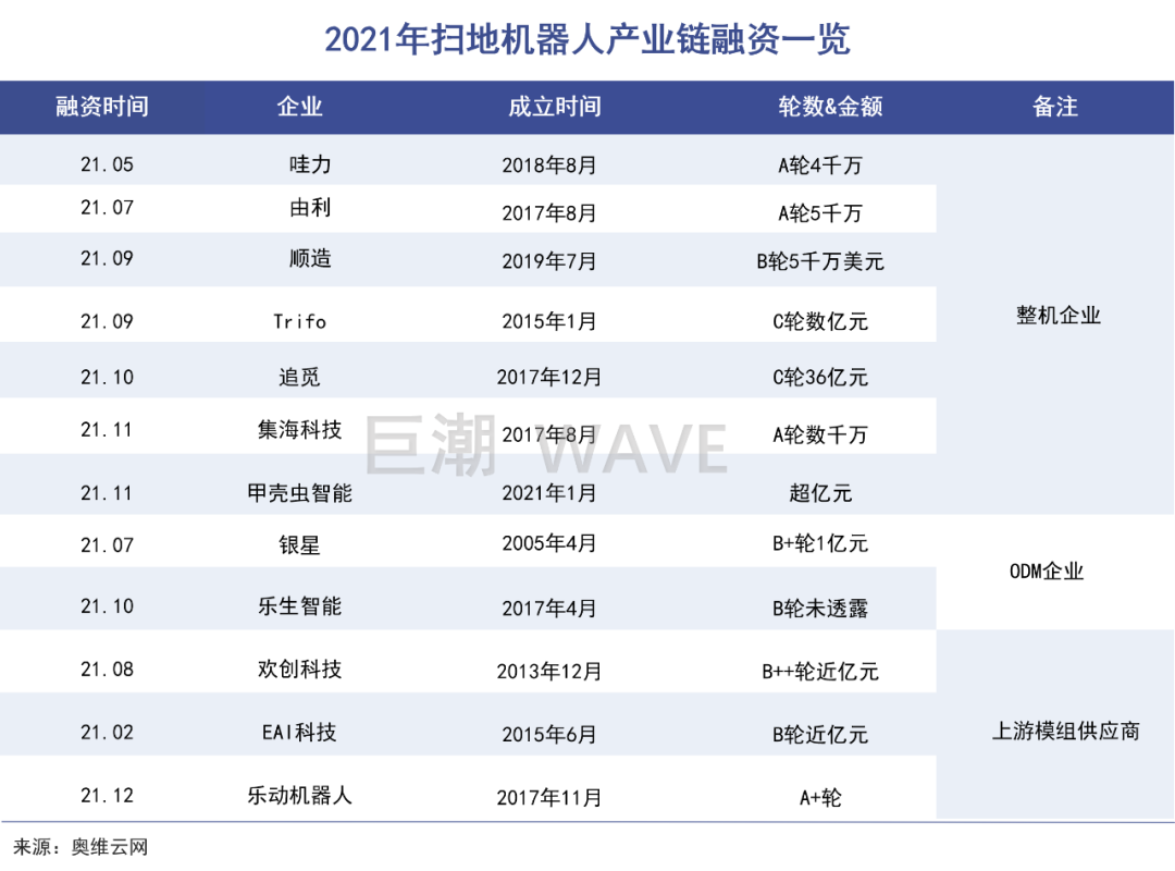 同样火爆的还有相关的一级市场交易。去年扫地机器人创业公司融资已经超过10余起,包括乐生智能、由利、Trifo、追觅科技等,几乎每个月都有品牌完成数千万级别的融资。