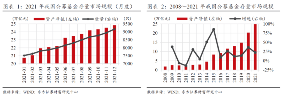 根据东方证券数据,2021年,我国公募基金市场保持高速发展,市场规模再创新高,达到24.8万亿元(数量总计9175只),增速22.5%。