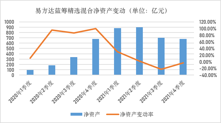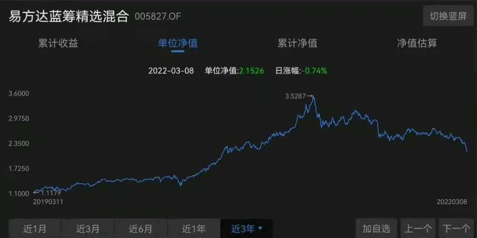 以易方达基金中人气最高的易方达蓝筹精选组合(005827)为例,这支基金在2021年年初净值一度攀升到3.5287,但在随后的一年多中,净值不断收缩,截止2022年3月8日,净值已从高位滑落约39%,至2.1526,几近腰斩。