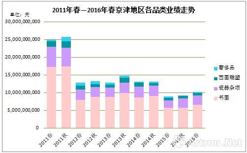 2012年以后,京津地区四大品类走势趋于平稳。2016年春拍北京地区投资导向占主流的仍然是书画,同比涨幅14.8%,撑起书画板块的仍是老面孔,如傅抱石、张大千等人,瓷杂同样是京津地区的主打,此次春拍涨幅达25.12%。春拍虽然一片叫好,但并非全线飘红,奢侈品受整体市场环境调整的影响较大,在2016年春拍中同比减少31.82%;油画及现当代艺术同比下降9.77%,一向以油画收藏为主的王中军在2016年春也换了风格投资古书画(在中国嘉德以2.07亿元的高价竟得曾巩的传世孤本《局事帖》)。唯一出彩的是北京保利的现当代艺术夜场成交了2.57亿,常玉的“1956年作 蓝色背景的盆花 布面油画”以3933万元拔的本场头筹。