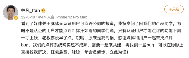 3月10日下午消息,脉脉“公司点评”机制被指客观性存疑,对此,脉脉创始人兼CEO林凡今日微博发文回应称,只有认证用户才可点评的功能下周一(14号)上线,脉脉公司点评系统确实还不成熟,需要企业和用户一起共建。