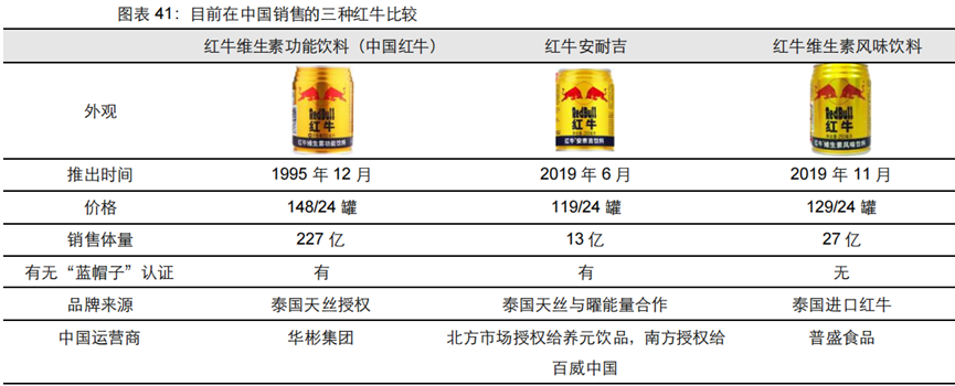 简单地说一下,目前市面上能看到的红牛产品主要有三种:红牛维生素功能饮料,也就是我们常说的中国红牛;红牛维生素风味饮料、红牛安奈吉饮料,这两款是泰国天丝2019年后推出的。