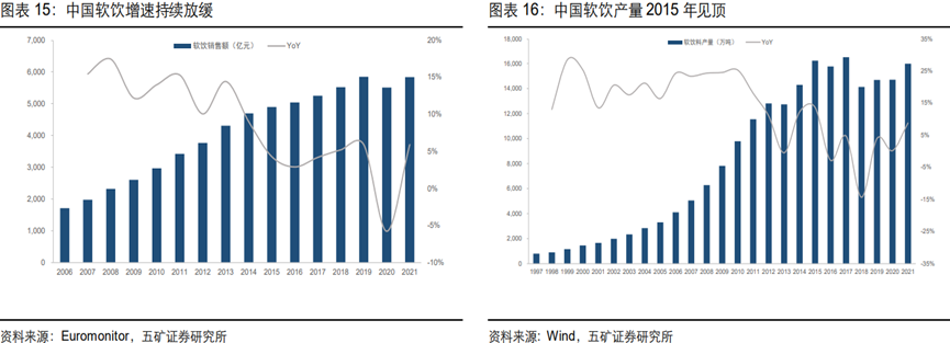 据五矿证券研究显示,2021年整个软饮行业销售额近6000亿,与2019年规模几近持平,近十年的复合增速则在5%左右。而产量已经在2015年基本见顶。