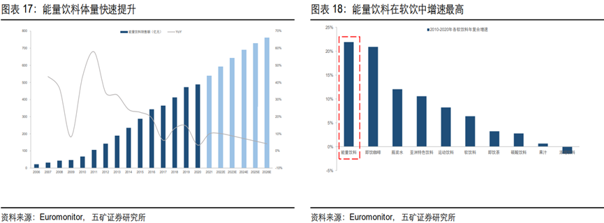 另外看整个行业的增长情况,从整个软饮行业来看,能量饮料赛道无疑是最亮的一颗星,当前仍属于蓝海赛道。