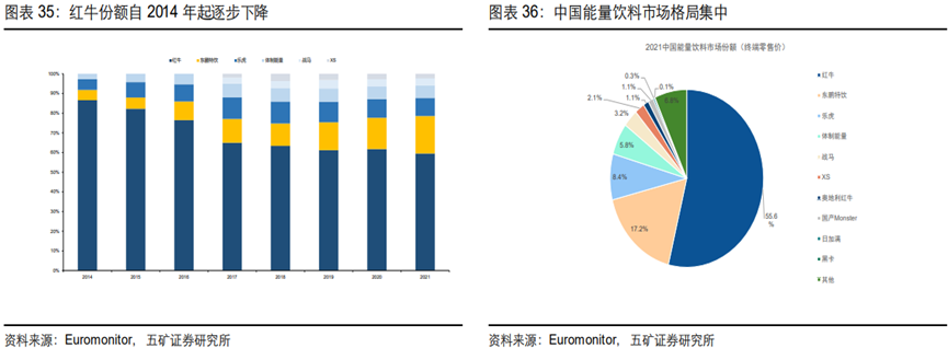 但红牛份额从2014年市占率高点80%持续下降至55%附近。自然,下降份额和行业增量被场内剩者瓜分。