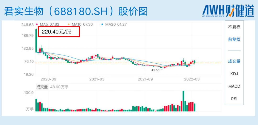 科创板上市当天,君实生物股价最高时达到了220.4元/股,根据当时总股本8.725亿计算,理论上巅峰市值接近1923亿元。