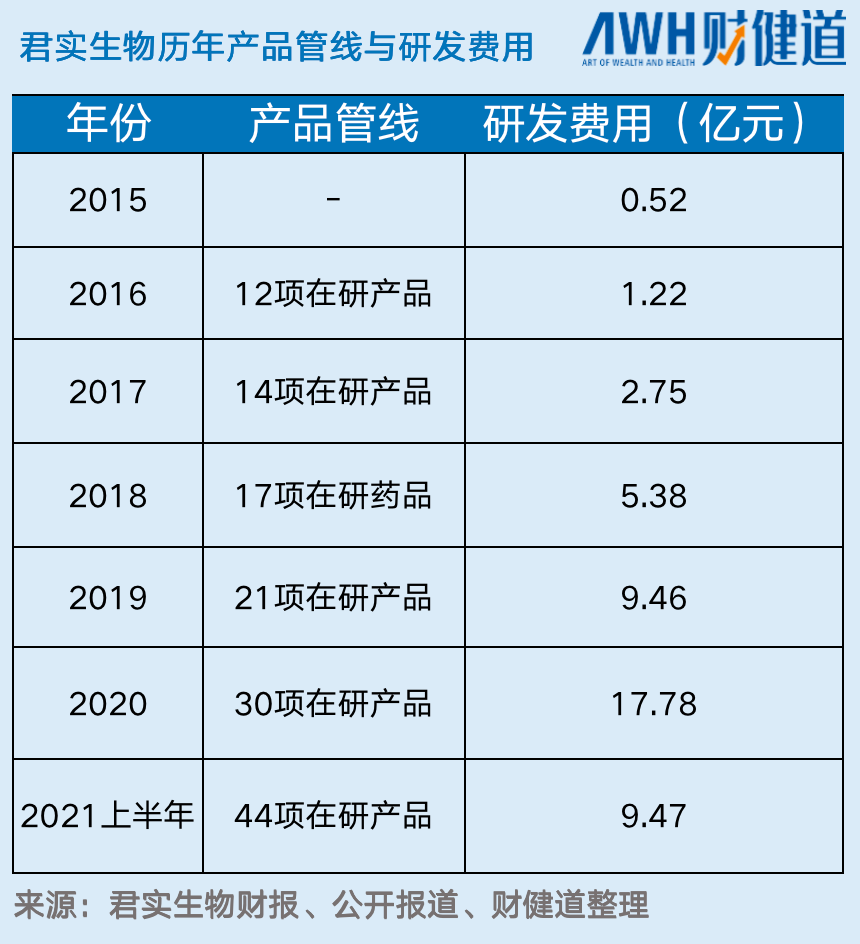在君实财务“体检表”上,历年财报数据中研发费用始终是最显眼的一条上升曲线,这和逐年增多的产品管线不无关联。