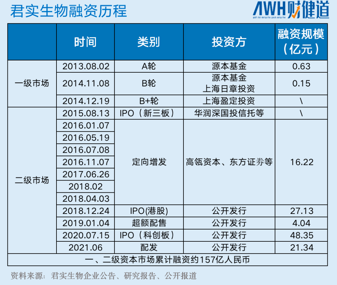 据《财健道》梳理,自2012年成立以来,君实生物(688180.SH)先后登录新三板、港股及科创板,进行过大大小小7次定向增发,贯穿新三板、A股、H股IPO前后,其仅在二级市场的总募资额就已超过117亿元。