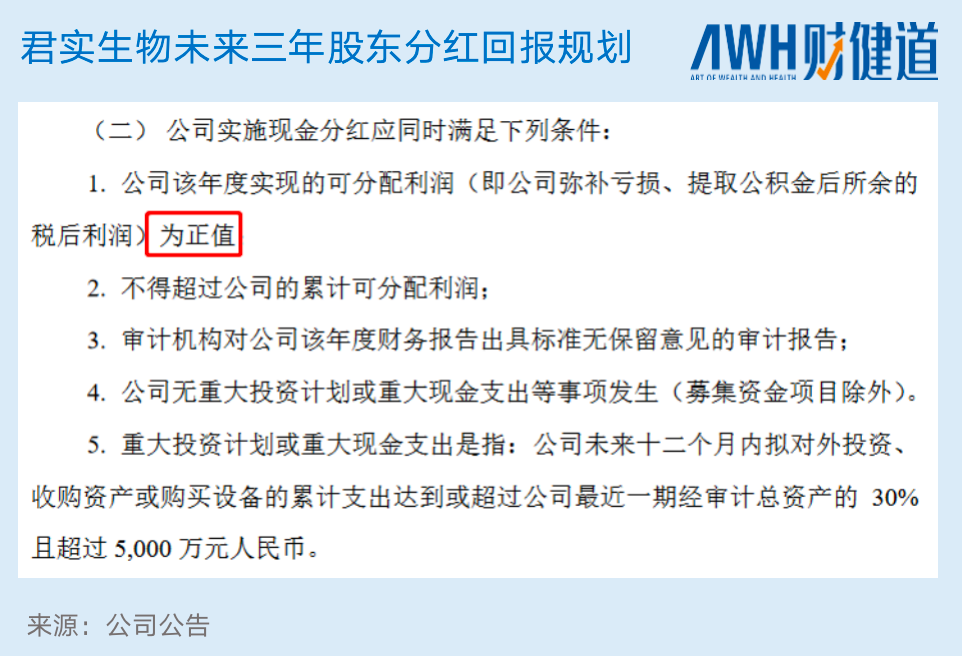 此次公布定增方案的同时,君实同样公布了一份未来三年给股东的分红计划。在可分配利润为正,且无重大投资计划或现金支出等情况下,公司将会提出差异化现金分红政策。