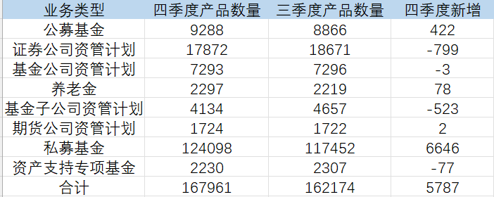 其中,公募基金规模高达25.56万亿元,力压私募基金的20.27万亿元,再次稳居第一把交椅。相较三季度末,去年第四季度公募新增422只产品,规模新增1.66万亿元。