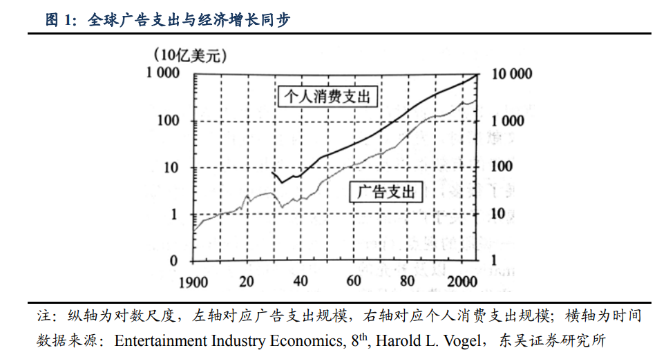 东吴证券梳理了全球广告跨度达105年的历史,得出了两个结论: