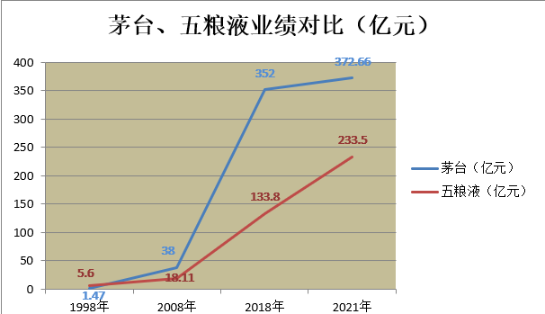 要知道,1998年茅台刚登陆资本市场时,五粮液的营收是茅台的4.6倍,净利润是茅台的3.9倍。在营收规模方面,2016年五粮液与贵州茅台的差距为156.11亿元,但到了近两年,差距已扩大至近400亿元。