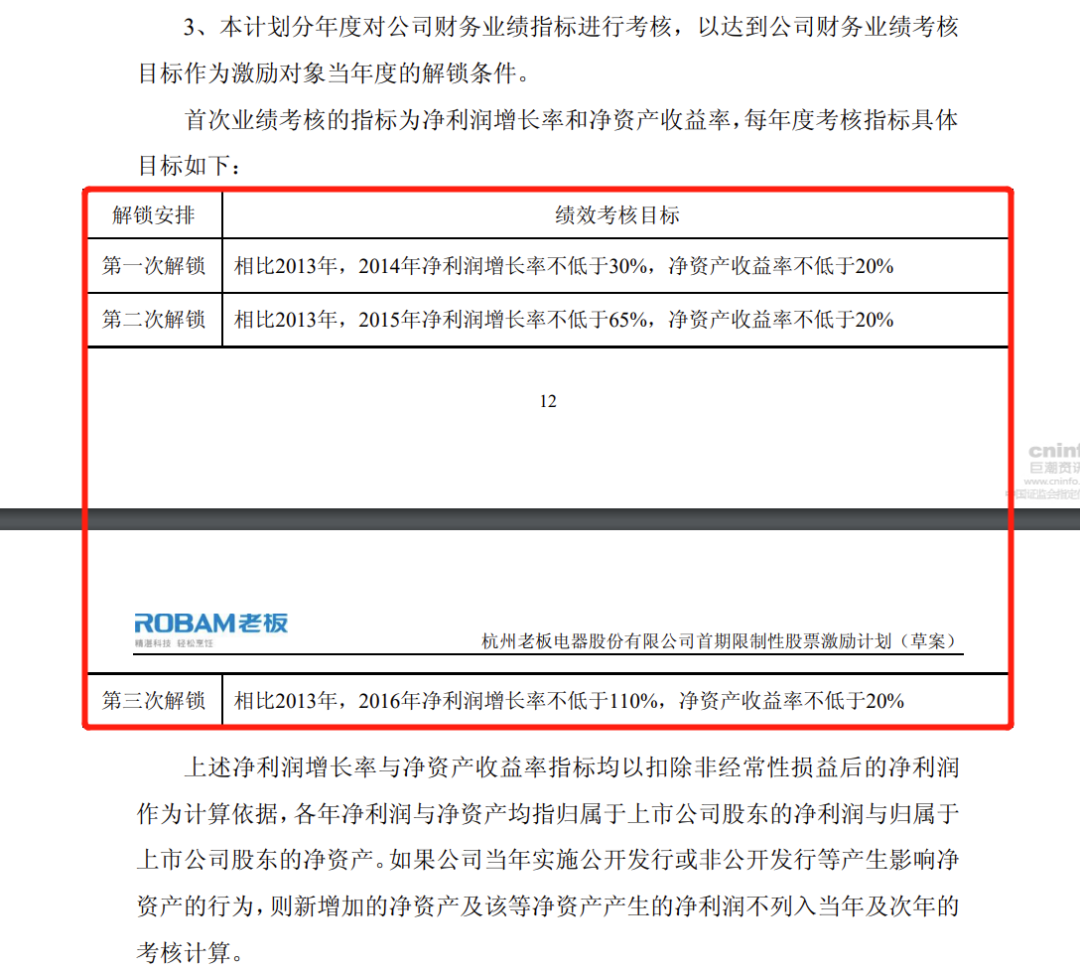 以2013年营业数据为基准,2014-2016各年净资产收益率≥20%,同时对各年的净利润增长率提出了要求,2014年净利润增长率≥30%,2015年净利润增长率≥65%,2016年净利润增长率≥110%。