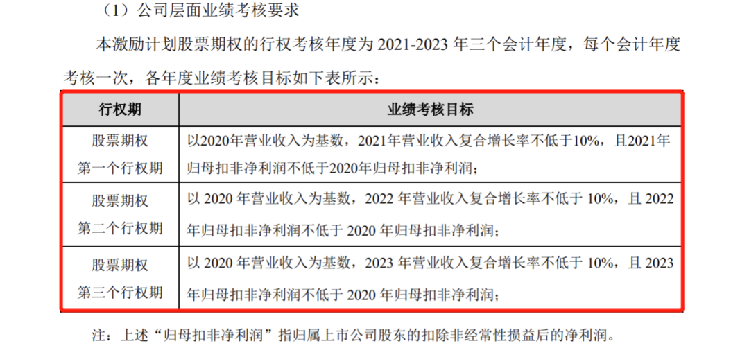 2021年,老板电器发布股权激励计划方案,确定了此后三年的年度业绩考核目标:2021-2023年,各年营业收入复合增长率≥10%,且归母扣非净利润不得低于2020年。
