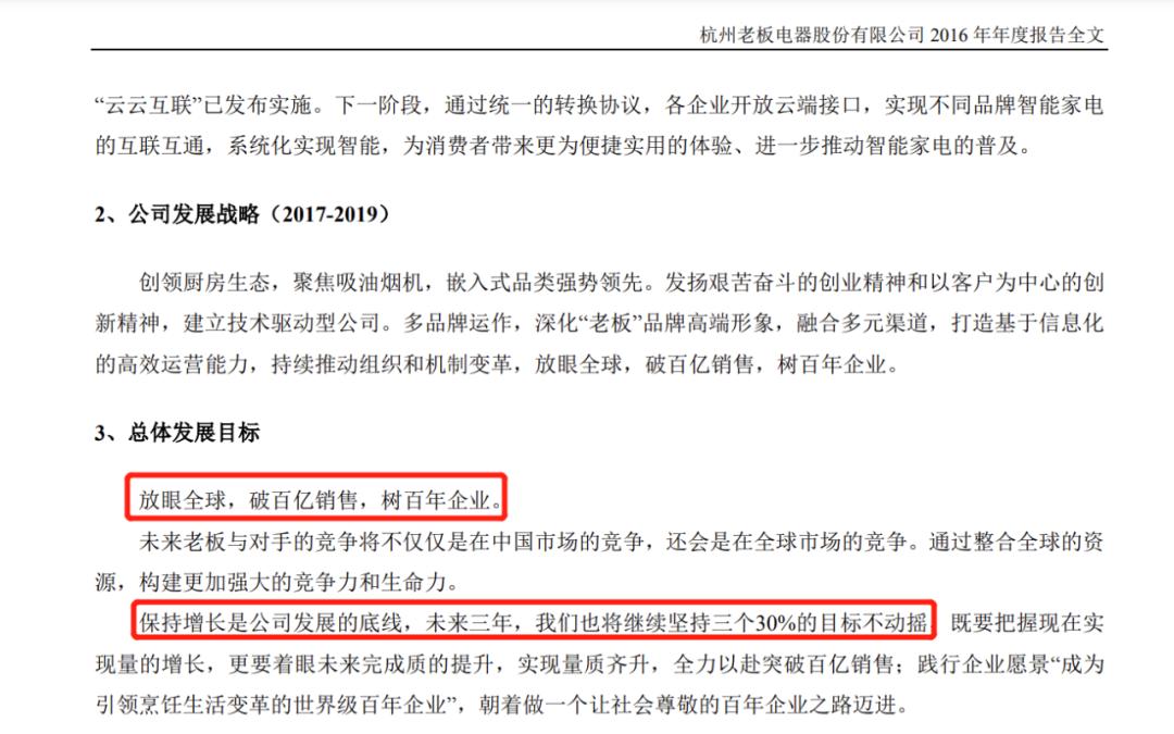 2017年,老板电器在2016年营收不足58亿的背景下,提出“破百亿销售,树万年企业”口号,计划在2019年做到百亿营收,击响了上市以来的第二鼓,冲击更高业绩。