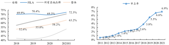 2016年开始高速发展的FILA仅2020年的总收入就达到174.5亿元,总营收占比49.1%,毛利率和市占率双双占优,门店扩张到逾2000家,成为安踏集团当仁不让的业绩造血主力。