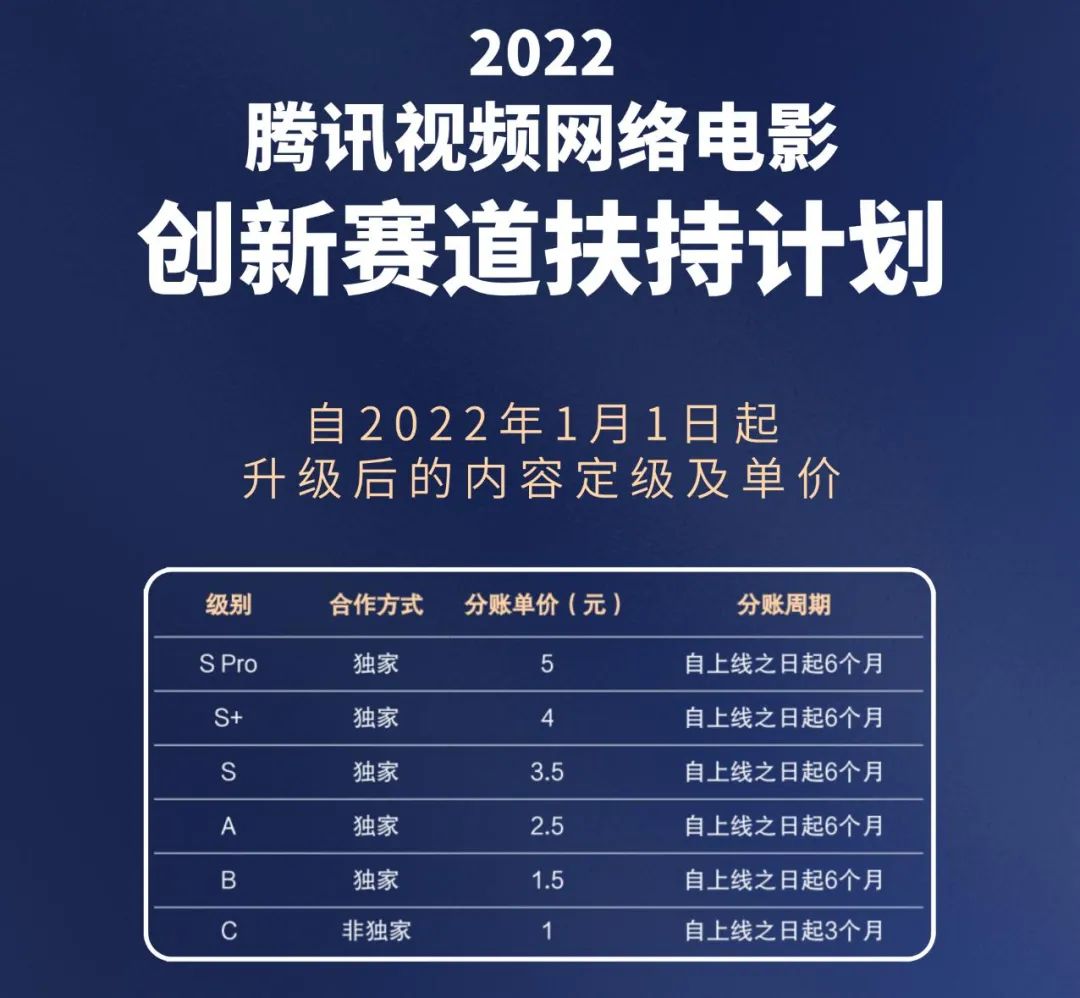 去年年末,腾讯视频宣布将发起“创新赛道扶持计划”,符合创新赛道标准的影片,将有机会被评选至新的评级S Pro级,该评级的分账结算单价将提升至5元/有效观影人次。