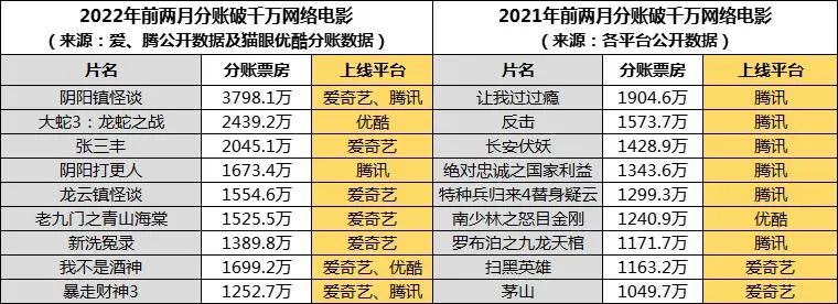 对比2021年前两月和今年前两月的三平台分账情况,不难发现,在过千万影片数量相同的情况下,今年前两个月头部分账表现整体优于去年同期。目前领跑的《阴阳镇怪谈》票房达到了近3800万,而去年同期领跑的仅在不足2000万量级。