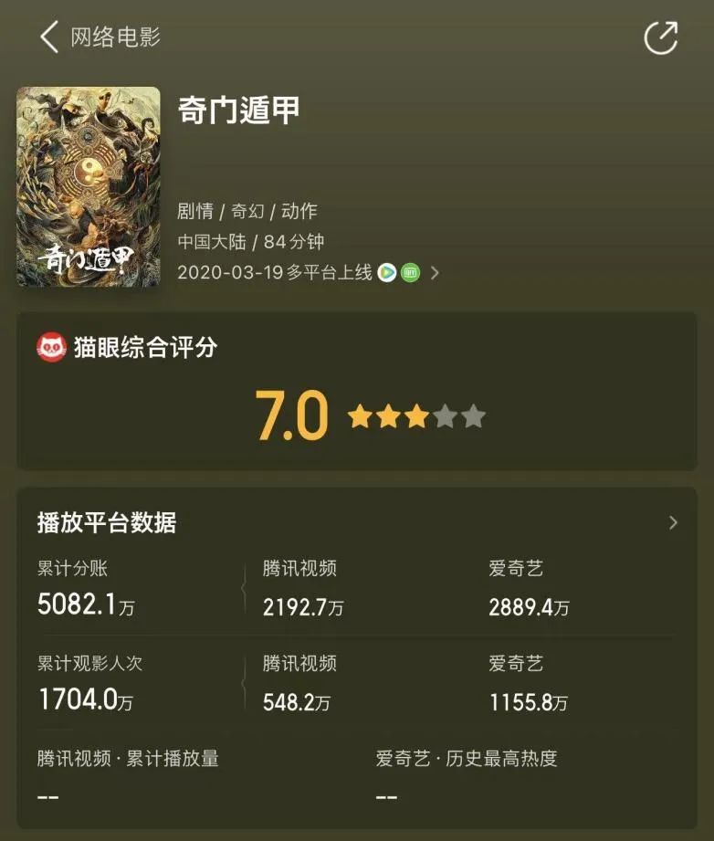 其一是网络电影拼播模式。以2020年于腾讯视频、爱奇艺双平台上线的《奇门遁甲》为起点,在这部影片斩获突破五千万的分账成绩后,拼播上线的网络电影开始频繁出现在市场,并且贡献了大量的分账破千万项目。