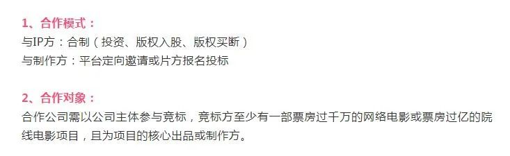 我们注意到,在这套合作模式下,IP方将以合制模式参与其中,但制作方则是由平台定向邀请或是片方报名投标。其中,竞标公司需作为核心出品或制作方,有一部票房过千万的网络电影项目或票房过亿的院线电影项目。