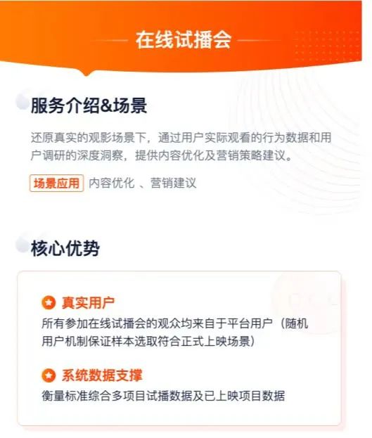 去年9月,灯塔针对网生内容开设了在线试播会产品。从介绍来看,这一产品与院线电影的传统试映类似,都是通过提前向部分用户试播来收集相关反馈意见,为项目的内容和营销等环节赋能。