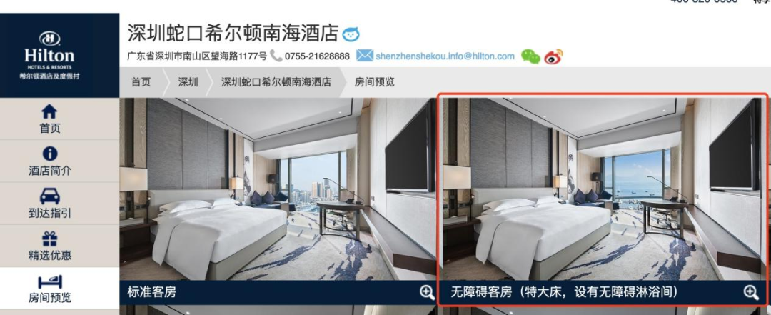 第二种是设计具备全套无障碍设施的独立房间,即在酒店设计建造的初期,选出几间房间进行全方位的无障碍改造以接待残障人士。如位于深圳的蛇口希尔顿南海酒店,在其房间预览中,就将无障碍客房作为单独的房型作为可选项。