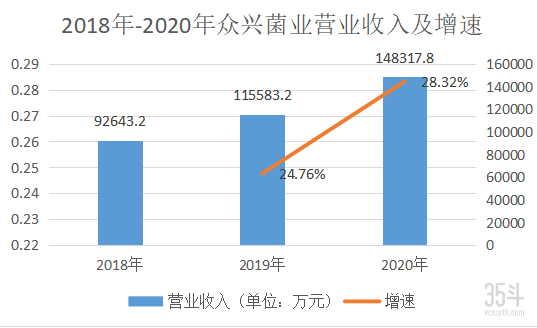 图:2018年-2020年众兴菌业营业收入及增速,数据来源:众兴菌业2020年年度报告