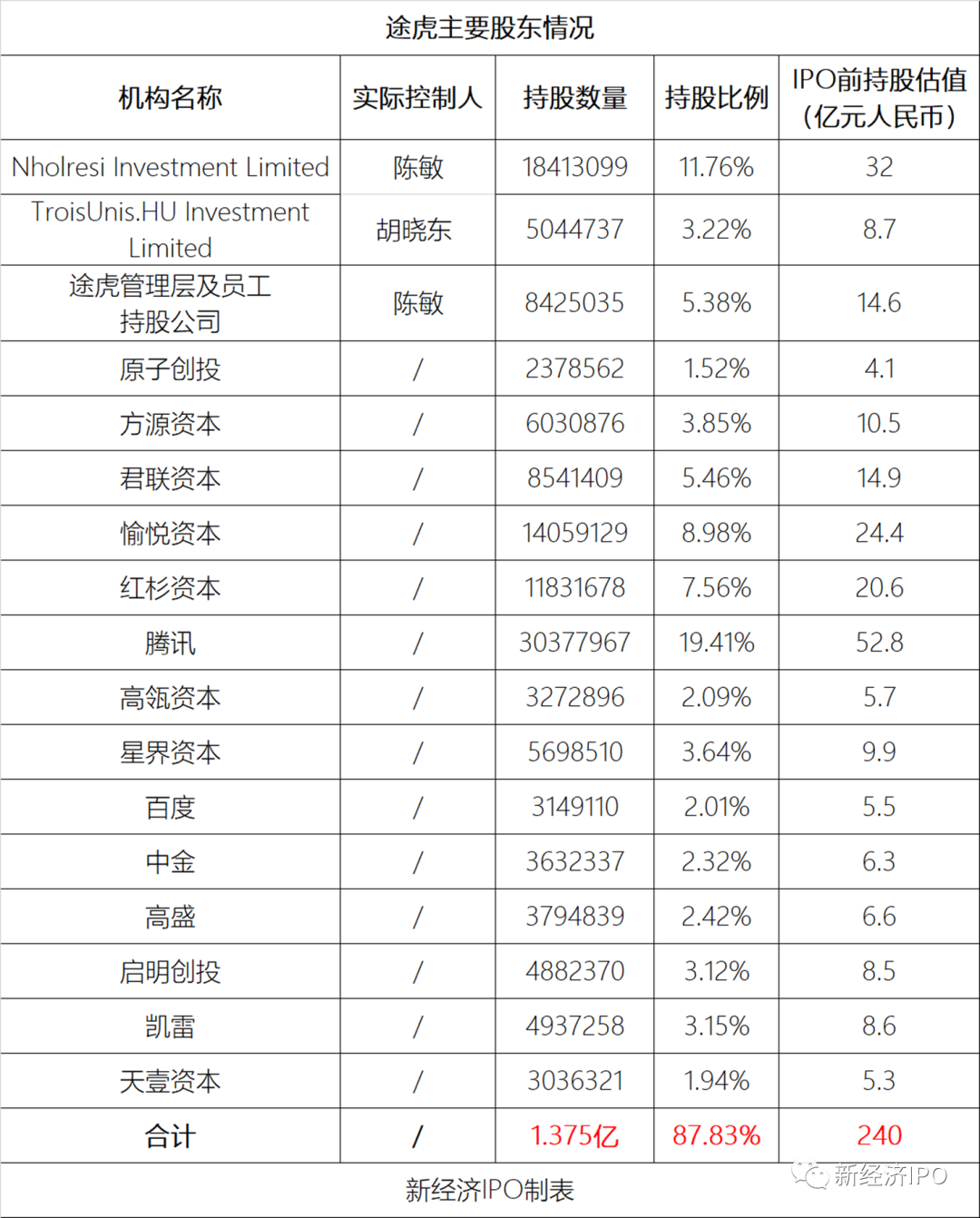 招股书显示,IPO前途虎股本总计为156,573,971,按最后一轮融资价格计算,途虎在本次IPO前估值约43亿美元(约合270亿元人民币)。