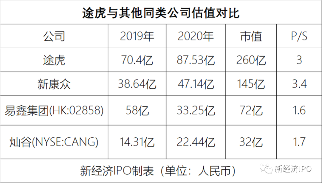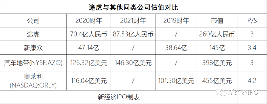 在港股市场上,途虎可参考的公司有易鑫和灿谷两家,新经济IPO将途虎、新康众、易鑫和灿谷2019年和2020年财务数据对比后发现,四家公司的P/S为3、3.4、1.6和1.7。