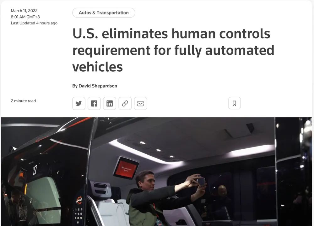 据悉,这项新规则于2020年3月首次提出,历经两年最终通过。根据新规,原有的“车辆需配备有一个司机座位、一个方向盘或者只有一个前排外侧乘客座位”的这些规定都已经不再是必需。
