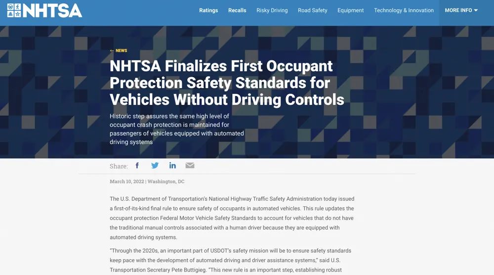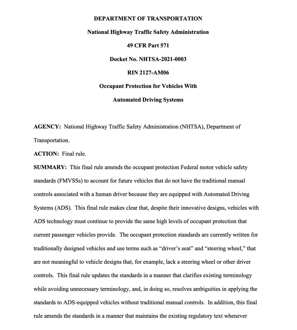 在这项新规颁布之前,美国的乘员保护标准是针对常见的、传统的车辆特征而编写的。但新规颁布后,乘员保护标准也进行了相应的更新——这些法规帮助明确了汽车制造商在生产没有传统手动控制装置的ADS的车辆时需要做什么来达到乘员保护标准。
