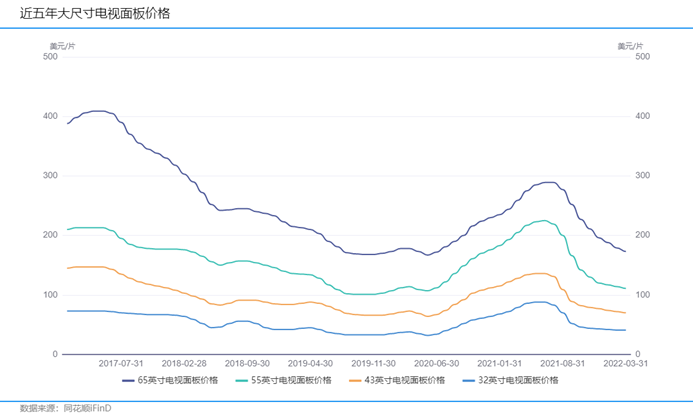 恰逢国内面板厂的新增产能爬坡,同时高世代线(10.5或11代线)助力经济切割效率,从2020年中到2021年中,国内面板厂商量价齐升,造就业绩神话。 而近几年,高世代线频频开出新产能,同时需求端的增长却乏力,供过于求的现象又一次出现。 IHS的数据显示,2020 年电视面板的需求(面积)占面板总市场的71.36%。因此,面板厂收入、利润的大头都聚焦在电视面板。而大尺寸电视面板从2021年中开始已经下跌了30-50%,目前还没有看到企稳的迹象。
