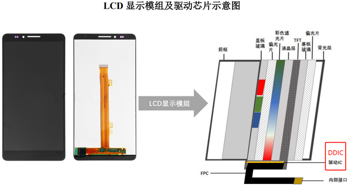 整体上看,可以分为面板主体和控制电路。控制电路中最重要的环节就是DDIC,用以实现显示从无到有,精准控制的过程。