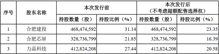 来源:晶合集成招股书 而DDIC正是面板行业非常重要的控制芯片。 通过数年的努力,以京东方为代表的大陆面板厂终于摆脱了国外的技术封锁,完成了面板显示的国产化替代。 正是由于下游面板的自主可控和产能放量,盘活了晶合集成这样的上游芯片供应商。 深度绑定下游大客户,是商业上屡试不爽的法宝。晶合集成也不例外,它与京东方有着耐人寻味的联系。 根据晶合集成的招股书,本次发行前,公司的前三大股东分别为合肥建投、合肥芯屏和力晶科技,三家持有合计80.43%的股份。