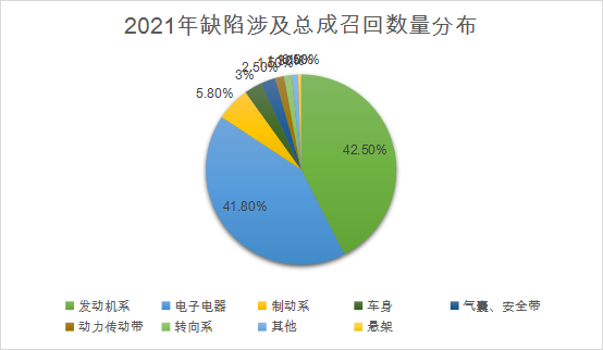 从召回原因来看,因发动机总成缺陷实施召回50次,涉及车辆371.3万辆,占召回总数的42.5%;因电子电器缺陷实施召回54次,涉及车辆365.0万辆,占召回总数的41.8%;因制动系缺陷实施召回21次,涉及车辆51万辆,占召回总数的5.8%;因车身问题实施召回26.1万辆,占召回总数的3%