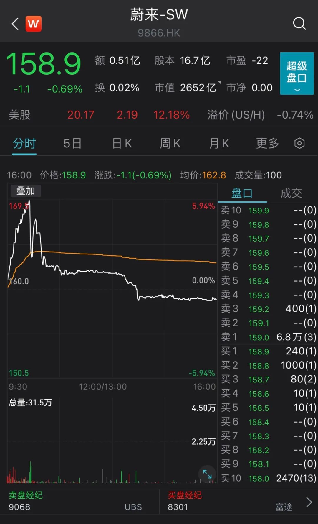 昨日9点,港交所开盘后,蔚来以9866的股票代码正式挂牌交易,开盘报每股160港元,昨日收盘时股价稍跌0.69%,最终收报于158.9港元/股,总市值为2652亿港元。
