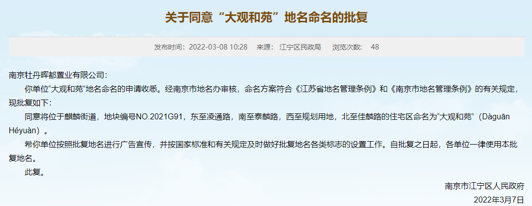 近日,江宁区人民政府网发布了《关于同意“大观和苑”地名命名的批复》,此地块正是位于城东汇通路板块的常州黑牡丹G91。