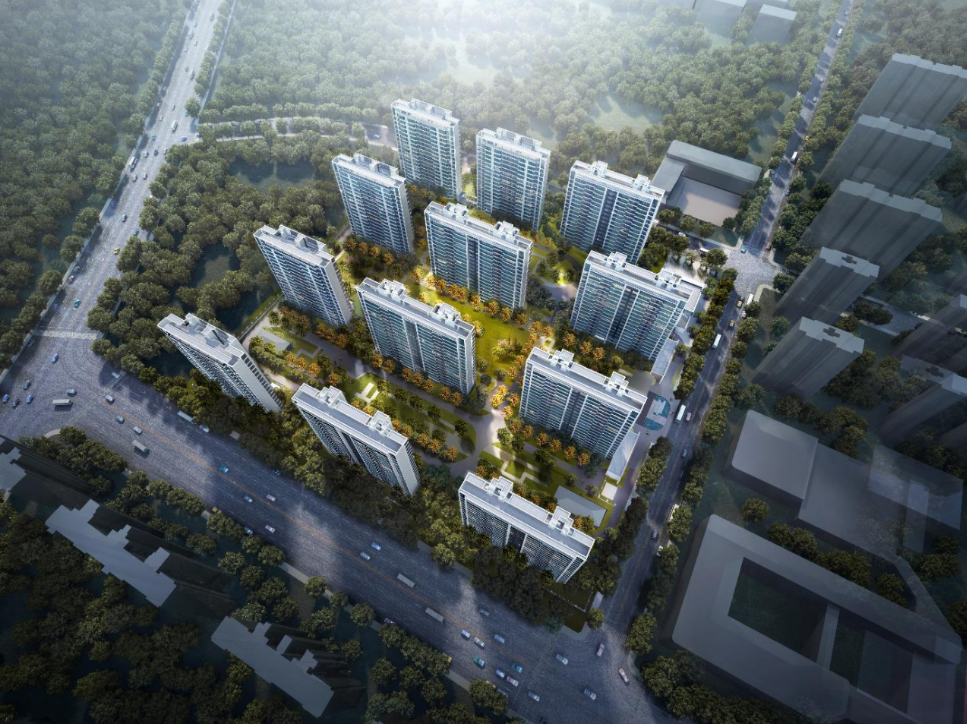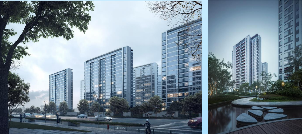 据效果图显示,该地块均为18层住宅楼,整体采用大面积玻璃幕墙组成,效果图中周边园景也能略探一二。