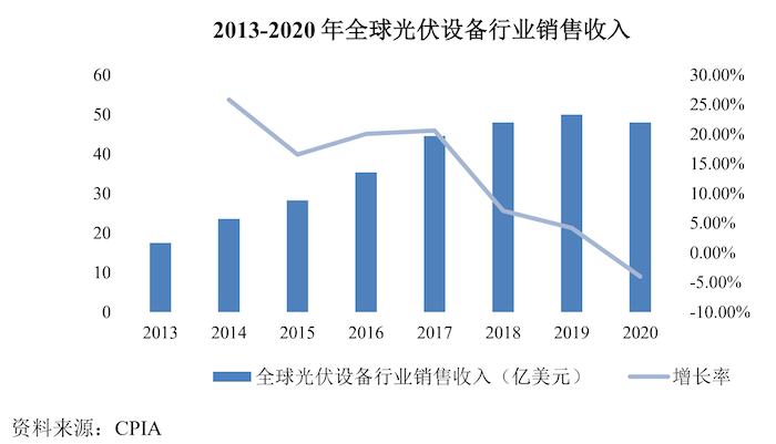 CPIA资料显示,2013年至2020年全球光伏设备行业表现平平,销售收入增速整体下行。