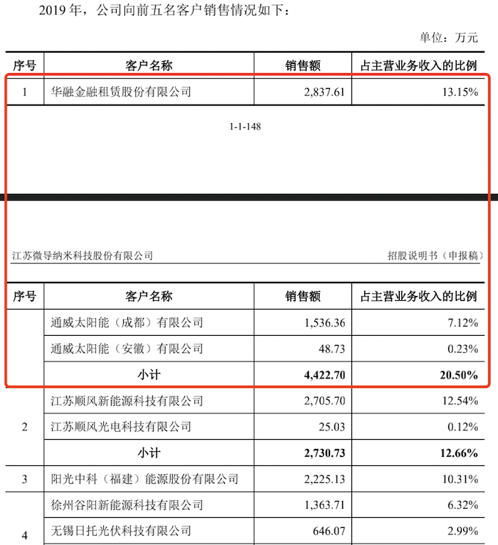 值得注意的是,在客户统计上,微导纳米将通威太阳能公司和华融金融租赁公司列为同一客户,但在应收账款项下单独列示。
