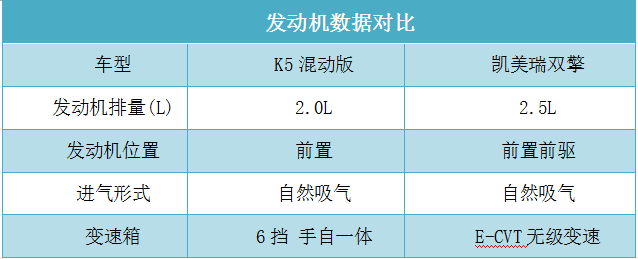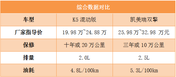 由于K5混动版所搭载的是一台2.0L发动机,而凯美瑞双擎搭载的是一台2.5L发动机,因此在动力参数上,凯美瑞双擎更具优势。并且单从电动机的功率与扭矩来看,也是凯美瑞更胜一筹。不过,K5混动版有相比凯美瑞双擎更低的油耗,其百公里综合和油耗达到4.8升,相比凯美瑞双擎低0.5升。(汽车商报-饭)